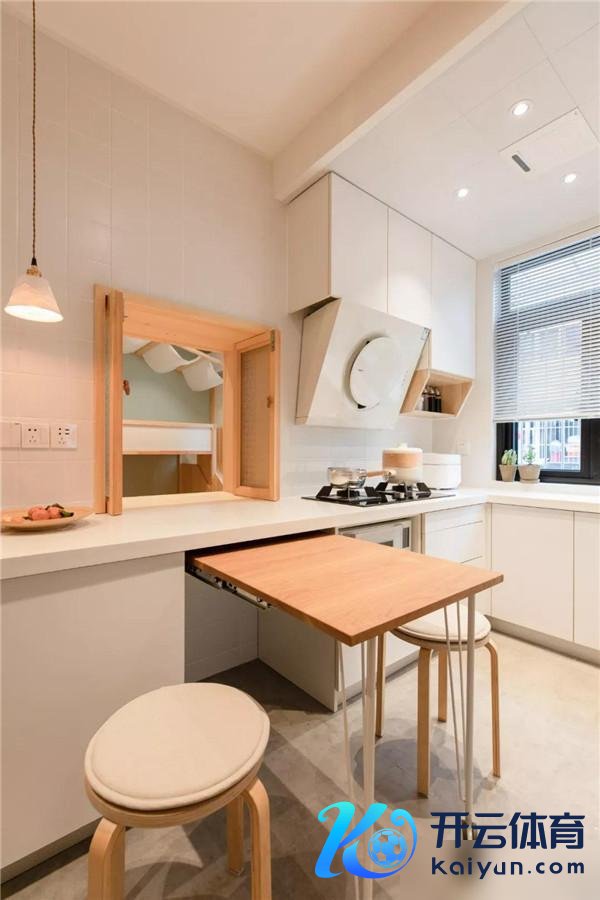 第二,他们也很明智地选择在夹缝中为餐桌成就出地柜表层桌面下方夹缝,这样餐桌能很机要塞收纳进柜子里,不占用空间,而当需要用到餐桌的期间径直转开柜门就能使用餐桌,不吃力气也不费时辰。